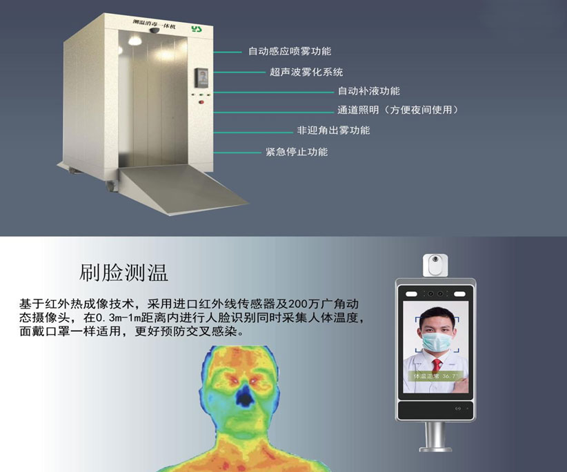 YSCX20-01A測溫消毒一體機是由浙江緣森生態環境科技有限公司自主研發和生產的測溫消毒產品,用于預防公共衛生事件發生,并在發生應急公共事件時,對公共空間入口通過的人進行體溫測定并同時可進行表面消毒。設備運行智能控制,無需專人控制,并內嵌人臉識別軟件,對進入人員進行體溫登記。消毒液采用食用型消毒液,設計科學安全,不對環境產生影響。應用范圍可適用于學校、社區、機場、酒店、醫院等人員聚集的公共場合。
